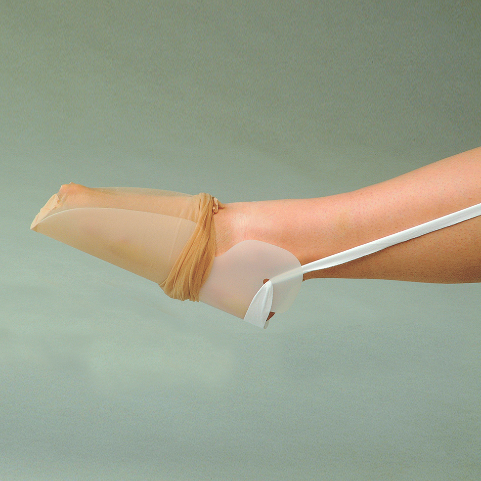 A ajuda para calçar calçador de meias possui um formato que permite manter a meia no dispositivo até esta se acomodar ao pé. A meia é colocada, deixando uma abertura para entrada do pé. O utilizador calça a meia puxando os fios do dispositivo com ambas as mãos. A ajuda para calçar calçador de meias é leve, flexível e económico. Indicado para meias não compressivas.